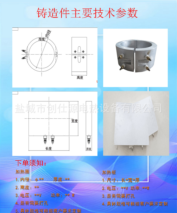 4、金属铸造加热器应做好定位固定,发热区需要和受热体紧密贴合,严禁空烧。发现表面有灰尘或污染物时,应及时清理干净再用,以免影晌散热而缩短使用寿命。