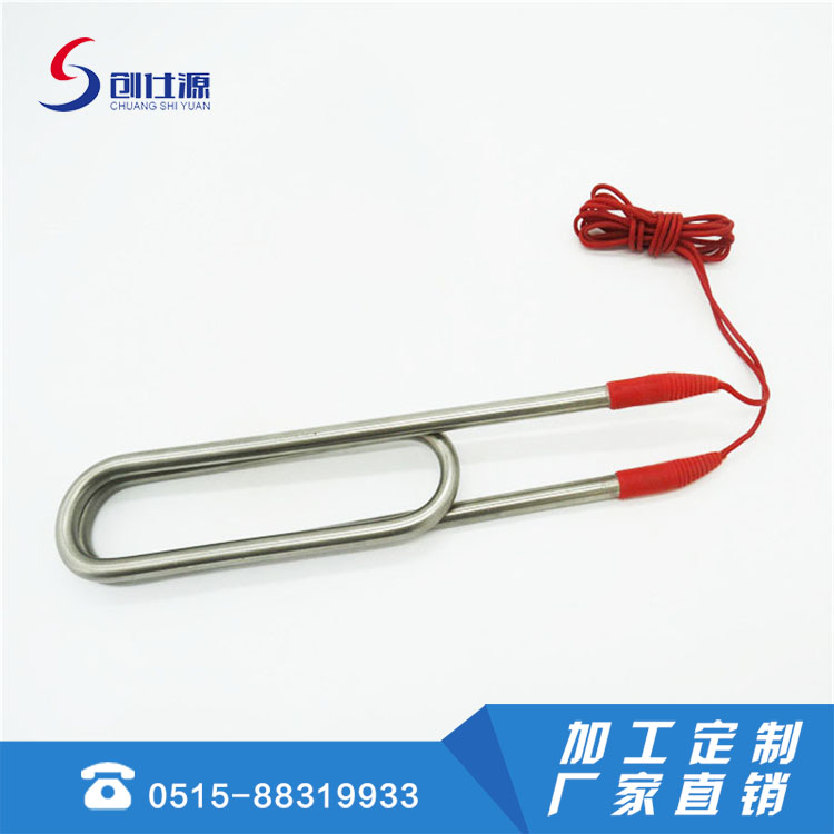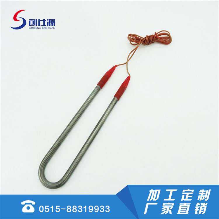 不锈钢双头电热管是以金属管为外壳,沿管内中心轴向均布螺旋电热合金丝(镍铬、铁铬合金)其空隙填充压实具有良好绝缘导热性能的氧化镁砂,管口两端用硅胶或陶瓷密封,这种金属铠装电热元件可以加热空气,金属模具和各种液体。主要形状有:U型、W型、直线型、L型、回针型、圆型、螺旋型、蚊香型等。