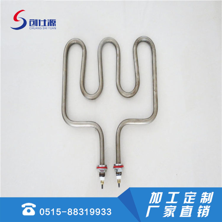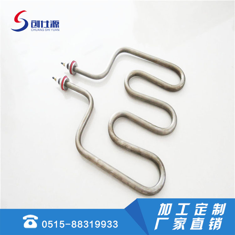 不锈钢双头电热管是以金属管为外壳,沿管内中心轴向均布螺旋电热合金丝(镍铬、铁铬合金)其空隙填充压实具有良好绝缘导热性能的氧化镁砂,管口两端用硅胶或陶瓷密封,这种金属铠装电热元件可以加热空气,金属模具和各种液体。主要形状有:U型、W型、直线型、L型、回针型、圆型、螺旋型、蚊香型等。