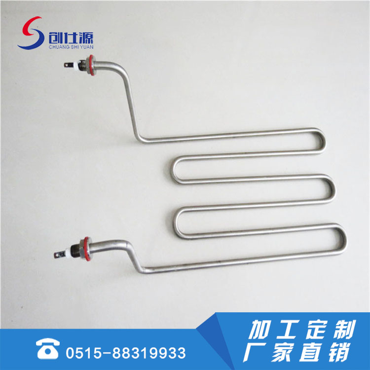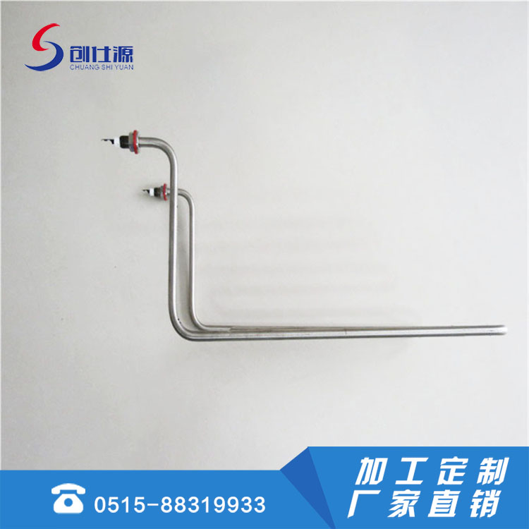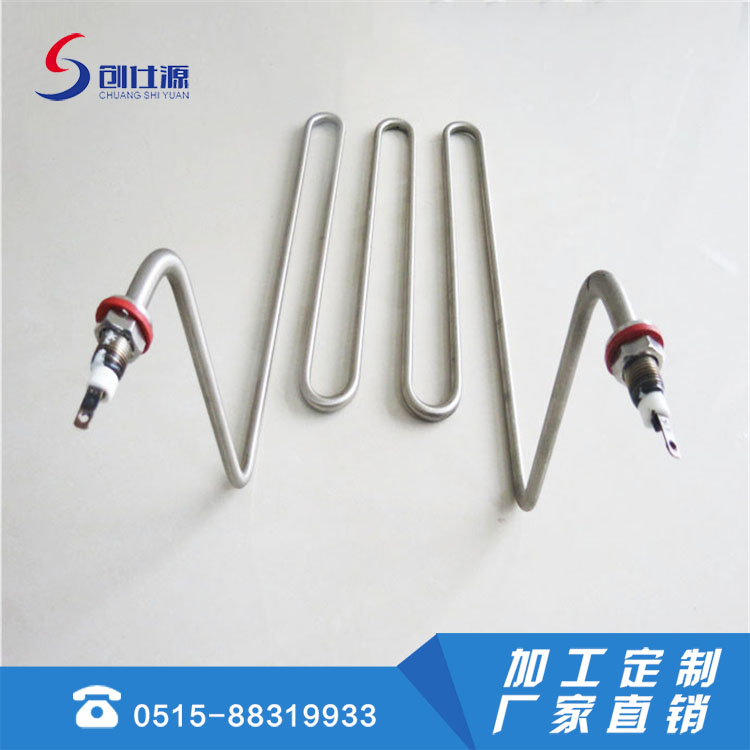 不锈钢双头电热管是以金属管为外壳,沿管内中心轴向均布螺旋电热合金丝(镍铬、铁铬合金)其空隙填充压实具有良好绝缘导热性能的氧化镁砂,管口两端用硅胶或陶瓷密封,这种金属铠装电热元件可以加热空气,金属模具和各种液体。主要形状有:U型、W型、直线型、L型、回针型、圆型、螺旋型、蚊香型等。