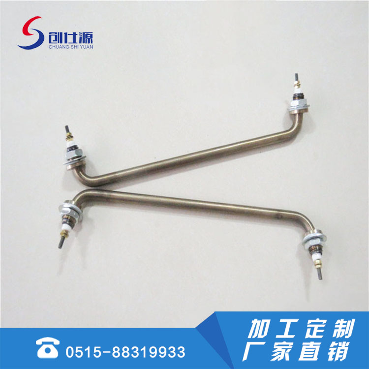 不锈钢双头电热管是以金属管为外壳,沿管内中心轴向均布螺旋电热合金丝(镍铬、铁铬合金)其空隙填充压实具有良好绝缘导热性能的氧化镁砂,管口两端用硅胶或陶瓷密封,这种金属铠装电热元件可以加热空气,金属模具和各种液体。主要形状有:U型、W型、直线型、L型、回字型、圆型,螺旋型、蚊香型等。