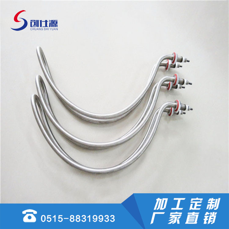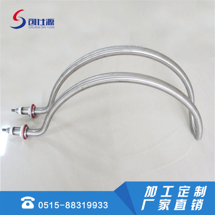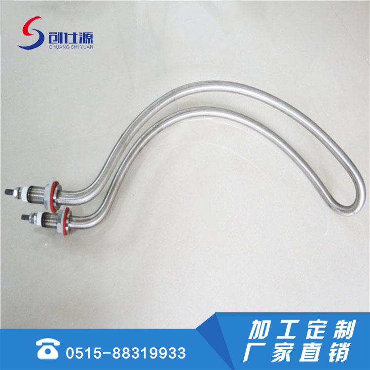 不锈钢双头电热管是以金属管为外壳,沿管内中心轴向均布螺旋电热合金丝(镍铬、铁铬合金)其空隙填充压实具有良好绝缘导热性能的氧化镁砂,管口两端用硅胶或陶瓷密封,这种金属铠装电热元件可以加热空气,金属模具和各种液体。主要形状有:U型、W型、直线型、L型、回字型、圆型,螺旋型、蚊香型等。