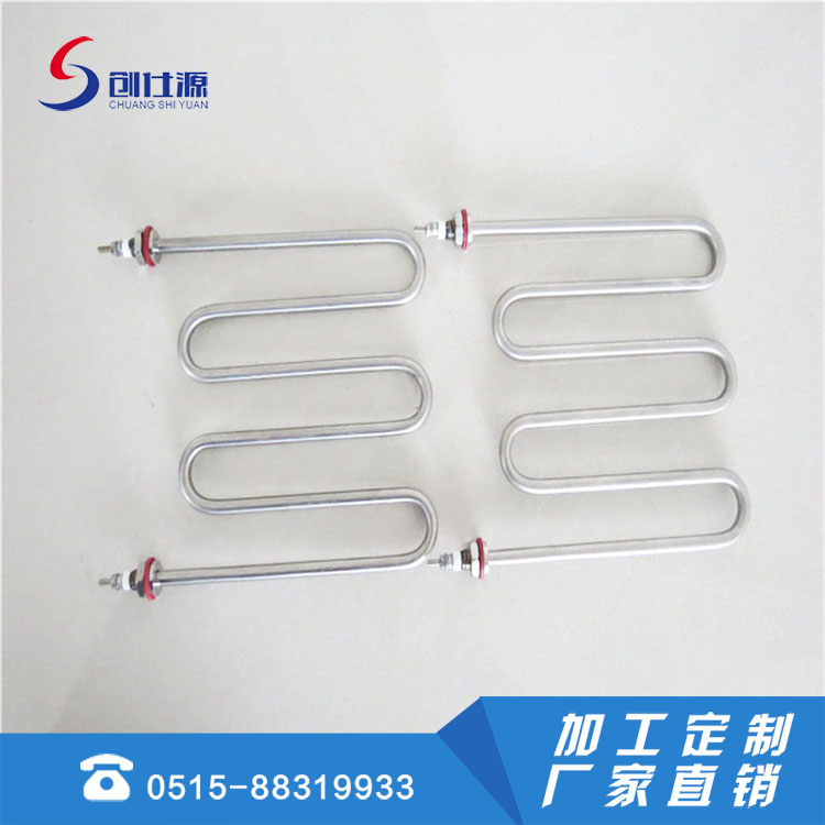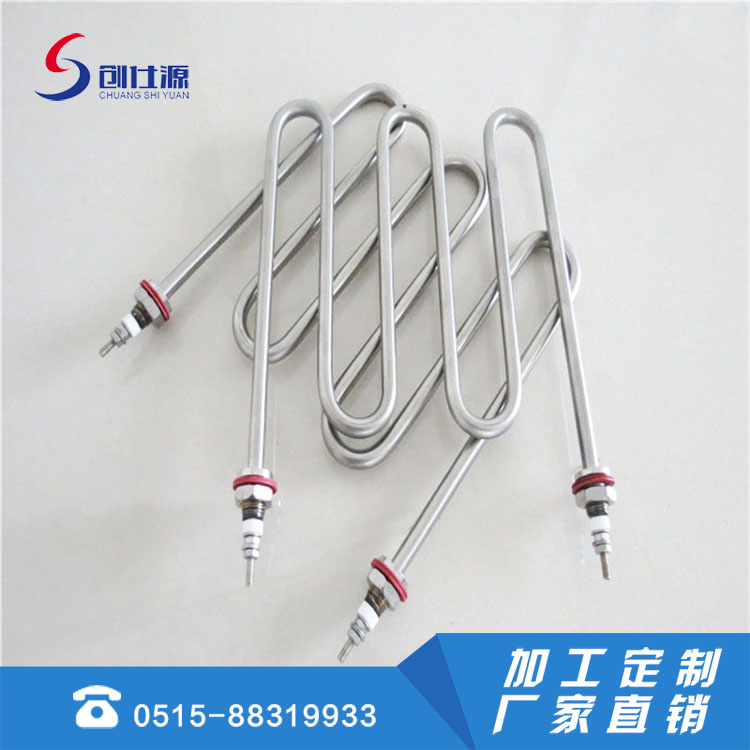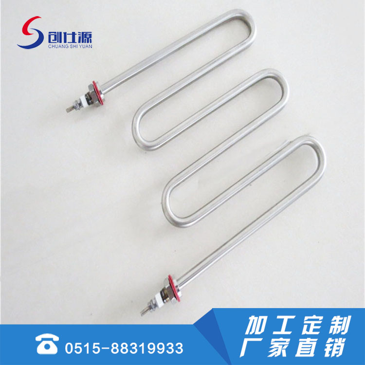 不锈钢双头电热管是以金属管为外壳,沿管内中心轴向均布螺旋电热合金丝(镍铬、铁铬合金)其空隙填充压实具有良好绝缘导热性能的氧化镁砂,管口两端用硅胶或陶瓷密封,这种金属铠装电热元件可以加热空气,金属模具和各种液体。主要形状有:U型、W型、直线型、L型、回字型、圆型,螺旋型、蚊香型等。