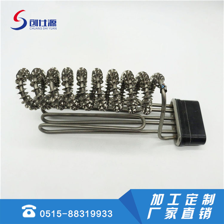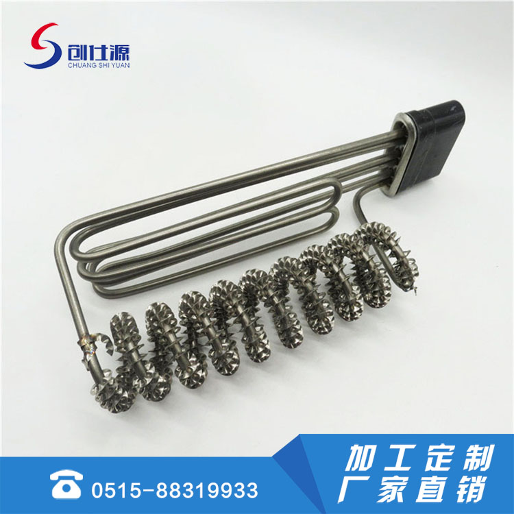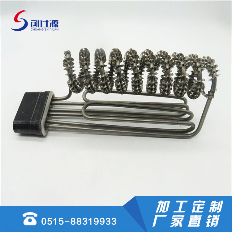 翅片加热管采用优质不锈钢、改性氧化镁粉、高电阻电热合金丝、不锈钢散热片等材料,在金属管中放入电热元件,并在空隙部分紧密填充有良好耐热性、导热性和绝缘性的结晶氧化镁/粉,通过先进的生产设备和工艺制作而成。翅片电加热管可以安装在吹风管道中或其它静止、流动空气的加热场合。 是在普通元件表面缠绕金属散热片,与普通元件相比散热面积扩大了2~3倍,即翅片元件所允许的表面功率负荷是普通元件的3~4倍。由于元件的长度缩短,使得本身的热损失减小,在相同的功率条件下具有结构简单,机械强度高、升温快、发热均匀、散热性能好、热效率高、使用寿命长、加热装置体积小,成本低,安装简便等优点。