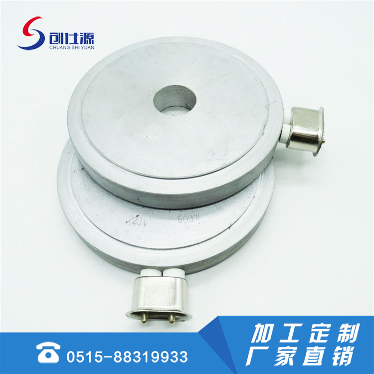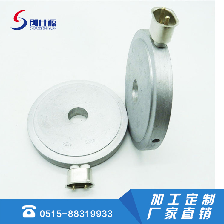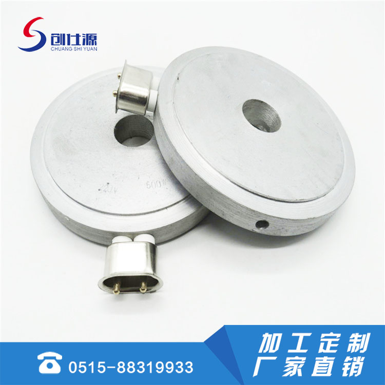 铸铝电加热器是金属铸造加热器是以管状电热元件为发热体,并弯曲成型,进入模具用金属合金材料为外壳以离心式浇铸成各种形状,有圆型、平板、直角型、风冷、水冷及其它异型等形状。