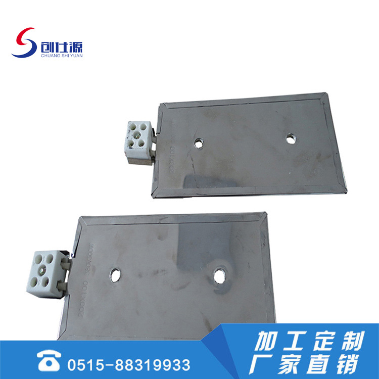 不锈钢云母加热器以0.3~0.5mm不锈钢板为外壳,中间以高绝缘性耐高温的云母板为芯,均匀绕以各种标准规格的镍铬合金电阻丝作为发热体,经成型机加工成各式所需形状。可根据用户需求的接线方式,电压从110V、180V、220V、380V等 ,功率负载每平方2-3W ,工作温度350℃左右。将外散热面增加保温装置,内散热面烧结红外线这样可节约用电35%。