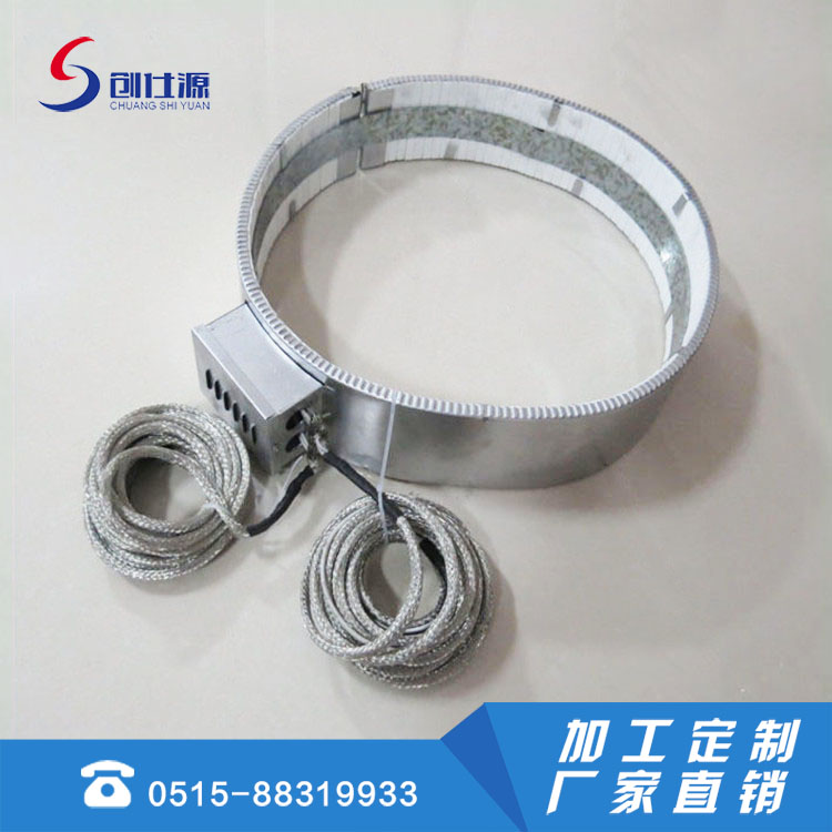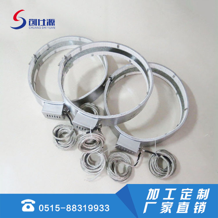 陶瓷加热圈采用陶瓷条穿丝方式,发热体为进口圆丝陶挠成弹簧状穿入陶瓷条圈成,外罩采用日本产不锈钢,中间采用高温隔热保温棉(硅酸铝纤维板)防止温度外泄。陶瓷条是高频陶瓷具有传热快、坚硬不易碎、高温不变形不易老化等优点。简要性能:其主要适用于挤压、浇铸和下冲式机械操作温度可达到 450度,红色陶瓷可耐700℃左右。表面负载4- 5W/cm。特点是寿命长耐高温,绝缘性高,加热快等特点。