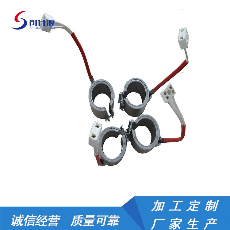 陶瓷加热圈采用陶瓷条穿丝方式,发热体为进口圆丝陶挠成弹簧状穿入陶瓷条圈成,外罩采用日本产不锈钢,中间采用高温隔热保温棉(硅酸铝纤维板)防止温度外泄。陶瓷条是高频陶瓷具有传热快、坚硬不易碎、高温不变形不易老化等优点。简要性能:其主要适用于挤压、浇铸和下冲式机械操作温度可达到 450度,红色陶瓷可耐700℃左右。表面负载4- 5W/cm。特点是寿命长耐高温,绝缘性高,加热快等特点。