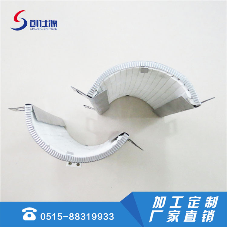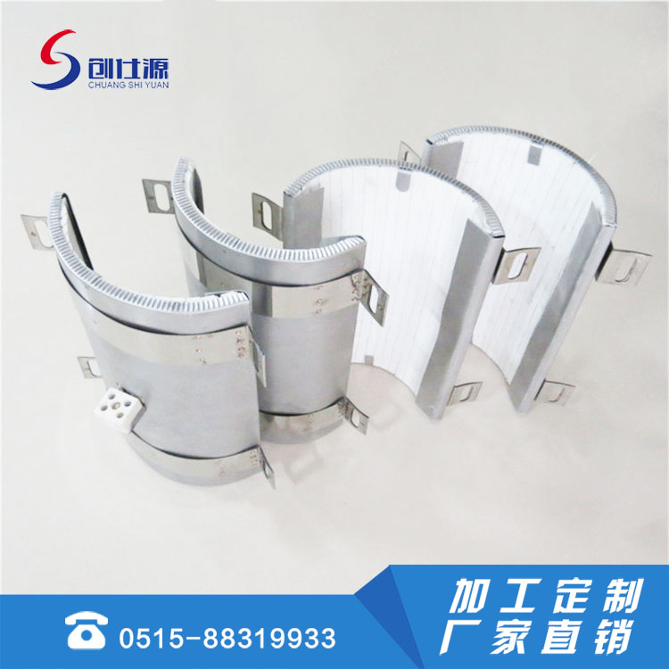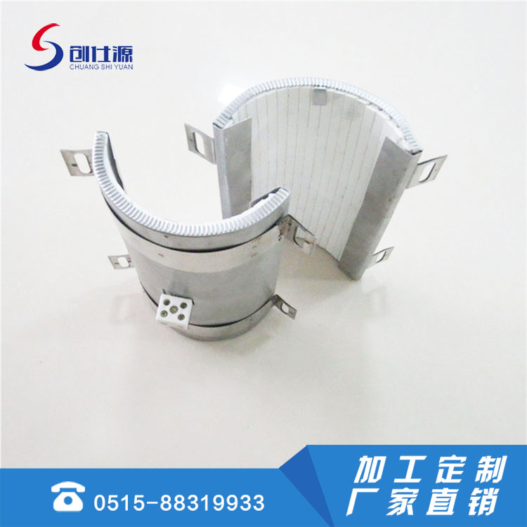 陶瓷加热圈采用陶瓷条穿丝方式,发热体为进口圆丝陶挠成弹簧状穿入陶瓷条圈成,外罩采用日本产不锈钢,中间采用高温隔热保温棉(硅酸铝纤维板)防止温度外泄。陶瓷条是高频陶瓷具有传热快、坚硬不易碎、高温不变形不易老化等优点。简要性能:其主要适用于挤压、浇铸和下冲式机械操作温度可达到 450度,红色陶瓷可耐700℃左右。表面负载4- 5W/cm。特点是寿命长耐高温,绝缘性高,加热快等特点。